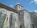 À l'extérieur, le clocher carré s'élève à la croisée du transept, où une coupole sur pendentifs a été aménagée. Construit au XIVe siècle, il est flanqué d'une tourelle d'escalier « en pomme de pin ». Des traces de fortifications (échauguette et mâchicoulis), mais aussi d'incendie, témoignent des combats des guerres de religion au XVIe siècle.