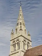 Les colonnettes, au nombre de neuf pour deux baies, sont en délit, poruvues de bases, et portent des chapiteaux sculptés de feuilles d'eau, de palmettes, de têtes d'angle monstrueuses ou humaines, et plus rarement de volutes d'angle et de feuilles plates. La sculpture atteint le même niveau de qualité qu'à l'intérieur, et le même motif ne se reproduit jamais à l'identique. Les tailloirs, d'un profil différent qu'à l'intérieur, se composent d'une plate-bande, d'une fine baguette, et d'un cavet. Ce profil se continue sur les étroits pans de mur qui séparent les baies des colonnettes d'angle. Les archivoltes sont moulurées d'un tore dégagé, qui est assez curieusement garni d'épines. Chaque archivolte est en outre surmontée d'un cordon doublement biseauté en forme de sourcil. Les murs se terminent par un bandeau saillant, la corniche d'origine ayant peut-être disparu. La haute flèche octogonale du XVIe siècle est cantonnée de quatre clochetons sur plan carré, qui sont coiffées de petites flèches ornées de crochets. Chacune des faces des clochetons est dominée par un gâble plein, dans lequel s'inscrivent des arcatures trilobées plaquées. Vers les quatre points cardinaux, la flèche présente une lucarne allongée sous sa plus simple expression. Afin d'alléger la structure, les faces de la flèche sont ajourés d'oculi et d'étroites ouvertures rectangulaires en alternance, dont les dimensions diminuent avec la hauteur croissante. Comme à Saint-Pierre de Senlis, dont le clocher roman possède également une flèche du XVIe siècle, la surface n'est pas recouverte d'écailles, et les assises sont simplement délimitées par de faibles ressauts[9].