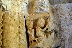 - Chapiteau N2 : les disciples et l'homme écoutant des chiens. Ce chapiteau est le mieux conservé de la série. Sur la corbeille se trouvent huit petits personnages, debout et côte-à-côte. Ils sont tous différents par leurs traits et gestes. L'avant-dernier à gauche est une femme, elle est pourvue d'une guimpe que surmonte une petite croix et elle exhibe un livre (Marie ?). L'homme à l'angle, au visage martelé, dont le bras droit replié vers le haut expose un objet ressemblant à une clef (saint Pierre ?). Ces personnages sont tous vertueux, ils sont l'exemple à suivre. Ce qui n'est pas le cas avec l'homme sur le tailloir. Il est accroupi et tient son menton, ou sa barbe, à deux mains ; il est absorbé dans ses pensées, lesquelles lui sont soufflées dans l'oreille droite par deux mammifères, dont un chien avec collier. Cet homme, affalé sur le sol comme un quadrupède, est un pécheur.