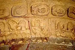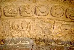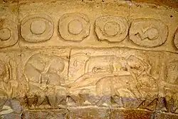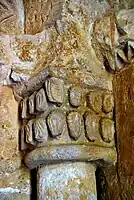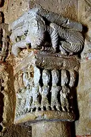 - Chapiteau N3 : les sirènes-oiseaux. La corbeille est très abîmée. Se discerne cinq petits êtres, parmi lesquels deux sirènes-oiseaux de sexe mâle, car barbus. Le tailloir est délimité par des dents de scie et, à l'angle, se trouve le masque d'un animal.