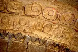 L'archivolte externe en ressaut s'orne d'une trentaine de soucoupes concaves, centrées par un besant. Certains de ces disques ont la forme de têtard, au-dessus de certains personnages clefs de la sarabande : la danseuse, le seigneur (deux), les bêtes de somme du laboureur et l'homme qui tient la queue du serpent dans la dernière séquence. La signification n'est pas évidente.