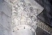 Il y a douze chapiteaux sculptés, dont sept sont historiés : quatre dans l'ébrasement occidental et trois dans l'ébrasement oriental. Ils sont alignés sous une frise alternant tailloirs et impostes, sur laquelle se déroulent des rinceaux à flabelles, palmettes et crossettes.
