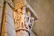 La représentation — et la dénonciation — des ébats masculins était fréquente dans les sculptures romanes, parfois très crues comme à l'abbaye de La Sauve-Majeure. Ici la pédophilie et l'homosexualité sont évoquées avec délicatesse.