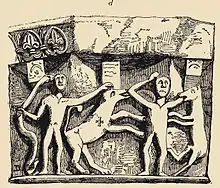 Deux quadrupèdes sont adossés. Leurs deux têtes se terminent par un bec d'oiseau et se rejoignent à l'angle pour picorer le coin supérieur d'un pavé carré. Cet objet semble être de production humaine et il est plausible que ces bêtes dévoyées se livrent à un sacrilège délibéré (sur un livre sacré, du pain bénit monastique ou une hostie carrée).