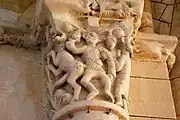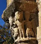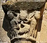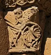 À l'ouest du chapiteau, un oiseau, et un homme bicorporé sur le tailloir et à l'est, l'ébauche d'un homme tenant une crosse en main. Sur le cordon oriental, un couple allongé. Deux hommes nus sont couchés l'un sur l'autre, tête-bêche. L'homme du dessus semble être un démon car il a des jambes velues, des pieds griffus et des cornes de satyre. L'homme du dessous porte une couronne de roi. Tous deux sont barbus, ils rient aux éclats et se tiennent par la main, comme des amoureux.