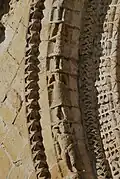 Premier arc (intérieur) : Sur l’archivolte, des étoiles, et sur l’arc, des chevrons opposés et un tore empâtant l’angle.