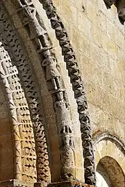 Chaque arc est composé de deux parties : de l’arc proprement dit formé d’une suite de claveaux, et, au-dessus, d’un cordon ou archivolte qui encadre les claveaux ; les arcs et les archivoltes sont couverts de sculptures de formes très variées.
