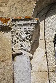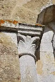 Sur l’un des chapiteaux, celui au nord, se trouvent quatre oiseaux se tournant le dos deux à deux, et, sur l’autre, des tiges entrelacées. Le tailloir de ce dernier est formé par un personnage bicorporé dont la tête couvre l’angle saillant du tailloir. Le costume de ce double corps se compose d’une simple tunique étroite du haut, large du bas, et assez courte pour laisser les jambes à découvert.
