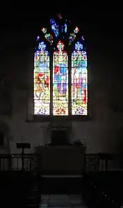 On note des vitraux remarquables[2], une dizaine de fresques du XVe siècle représentent des apôtres et des évangélistes au-dessus des croix de consécration et, entre autres, quatre statues classées monuments historiques :