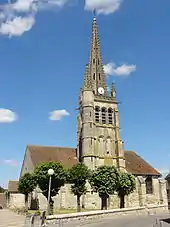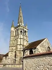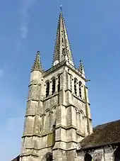 Le clocher constitue l'unique élément réellement abouti de l'église, l'intérieur n'étant que le résultat de reprises successives effectuées, en quelque sorte, au rabais : il n'y a pas de symétrie entre nord et sud, même en faisant abstraction de l'irrégularité entraînée par la présence du clocher ; il n'y a aucun arc-doubleau à proprement parler, ni de formerets ; le pourtour de la plupart des baies est dépourvu de mouluration ; deux fenêtres seulement sont munies d'un remplage ; et les fausses voûtes des frères Colas ont l'effet d'un pastiche. La position du clocher au milieu du bas-côté sud est l'exception : la plupart des clochers flamboyants de la région occupent la première travée du bas-côté sud. Il se compose d'une tour à trois niveaux d'élévation, et d'une flèche de pierre de 19 m de hauteur, dont le sommet cumule à une hauteur de 40 m au-dessus du sol[5],[7]. Les quatre angles du clocher sont flanqués par deux contreforts orthogonaux, dont aucun n'est visible depuis l'intérieur de l'édifice, contrairement à Baron, Montagny-Sainte-Félicité et Versigny. Ce détail surligne l'ambition des bâtisseurs du clocher. Il est vrai que les contreforts des angles nord-ouest et nord-est sont moins saillants, et par conséquent, ils ne se retraitent que légèrement à la limite entre les étages. Au sud-ouest, les contreforts encadrent une tourelle d'escalier octogonale, du même type qu'à Baron et Montagny-Sainte-Félicité. En haut du rez-de-chaussée et du premier étage, les contreforts du sud se retraitent par des glacis très faiblement inclinés, ce qui est atypique. Au niveau du seuil des fenêtres de chacun des étages, les contreforts et la tourelle d'escalier sont en plus scandés par un larmier en profil de doucine, fortement abîmé à de nombreux endroits. Il est à noter que la fenêtre du rez-de-chaussée descend légèrement plus bas que le premier larmier, et que son allège se termine par un glacis pentu non mouluré. Seules les baies du premier étage prennent appui sur un larmier établi en continuité avec ceux des contreforts, et adoptant le même profil. Les baies de l'étage de beffroi s'ouvrent au-dessus d'un glacis pentu, inférieurement terminé par une moulure torique. C'est au niveau des impostes de ces baies que les contreforts s'amortissent par un glacis formant larmier. Contrairement à de nombreux clochers flamboyants, ils ne sont pas couronnés par des clochetons ou pinacles. En revanche, le maître d'œuvre a prévu un dispositif décoratif qui n'existe pas sur les autres clochers flamboyants de la région, presque toujours extrêmement austères jusqu'à l'étage de beffroi : ce sont des baies simulées au niveau du premier étage. Elles sont en plein cintre, et au nombre de deux par face. Leur archivolte, taillée en forme d'un quart-de-rond, est surmontée d'un bandeau, et retombe sur des tablettes moulurées selon le même profil, portées par des chapiteaux sculptés de personnages en buste en haut-relief. Le profil de l'archivolte se continue ensuite sur les piédroits[9].