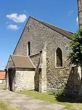 Plus sobre encore, voire rustique, est l'élévation latérale du collatéral sud du chœur, qui est recouvert d'un toit en appentis allant jusqu'au faîtage du vaisseau central. Ici, les contreforts ne présentent aucun élément de scansion outre une retraite grâce à un fruit, et il n'y a pas de larmier à la limite des allèges. Le chevet, dissymétrique, englobe l'ancien pignon du vaisseau central de la première moitié du XIIe siècle, identifiable grâce à deux contreforts plats, qui se retraitent une fois par un fruit, puis s'achèvent par un court glacis sans larmier. Comme déjà mentionné, le mur du collatéral sud ne garde aucune trace d'une éventuelle baie orientale, et le pignon ne montre pas non plus la moindre ouverture. La baie orientale du vaisseau central du chœur est la seule de toute l'église qui est surmontée d'un bandeau mouluré, entourée de moulures, et pourvu d'un remplage. Sa partie basse comporte trois lancettes à têtes tréflées, qui se singularisent par un tracé en anse de panier, et un lobe central trois fois plus large que les autres, qui se limitent par ailleurs à un quart de cercle. La lancette médiane est surmontée d'une lancette analogue, qui est subdivisée en deux segments par un dard, ce qui rappelle le dessin d'une clé de voûte présente en plusieurs exemplaires à l'intérieur de l'église. Les deux compartiments voisins du tympan ont les pourtours festonnés, mais ne contiennent ni soufflet, ni mouchette.