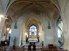 À l'instar de la nef, le chœur présente deux élévations latérales différentes, et il apparaît clairement qu'il est issu, dans sa forme actuelle, de la transformation d'une structure plus ancienne. Au sud, les grandes arcades, à peine moulurées, sont analogues à celles au sud des deux premières travées de la nef. Pour supporter le doubleau intermédiaire du chœur, un dosseret est engagé dans le pilier rectangulaire qui les sépare. Au nord, les grandes arcades sont moulurées selon le même profil que celles de la base du clocher, et au nord de la troisième travée de la nef. Au milieu, le rouleau inférieur retombe sur des demi-piliers cylindriques engagés, et le rouleau supérieur se fond dans un pilier cylindrique aux trois quarts libres, qui sert également de support au doubleau intermédiaire. Tant au sud qu'au nord, les arcades, sans être réellement élevées, représentent au moins les trois quarts de la hauteur des murs, et ne laissent pas la place à des fenêtres hautes. Le chevet est éclairé par une fenêtre au remplage potentiellement néogothique. — Les deux travées gardent leurs voûtes du début du XIIIe siècle, ou au moins leurs ogives, car à l'instar des troisièmes travées des bas-côtés, les voûtains cachent leur véritable nature, et sont susceptibles d'avoir été refaits en matériaux légers. Il n'y a pas non plus de formerets. Les ogives adoptent l'un des profils les plus courants à la première période gothique, qui est formé par une arête entre deux tores. Employé pendant une longue période de près d'un siècle, de 1140 à 1240 environ, ce profil ne saura servir d'indice pour établir une datation. Il en va de même des clés de voûte, qui sont de petites rosaces feuillagées, telles qu'utilisées au dernier quart du XIIe et au premier quart du XIIIe siècle. Le doubleau intermédiaire n'est pas plus éloquent : ce n'est en fait qu'une arcade aux arêtes chanfreinées, un peu plus basse que les voûtes, et constitue sans doute un vestige de la précédente église. Comme de nombreuses églises romanes, elle devait posséder une abside plus basse que la première travée du chœur, qui sert habituellement de base au clocher. Quoi qu'il en soit, la seconde travée du chœur aurait été reconstruite au XIIIe siècle avant la première, qui ne fut pas jetée bas mais seulement reprise en sous-œuvre, afin que la continuité du culte puisse être assurée sans grandes interruptions.