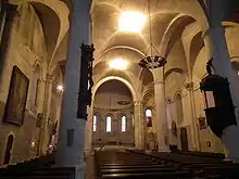 Basée sur un plan basilical, l'église se compose d'une vaste nef divisée en cinq travées, bordée de bas-côtés étroits mais de même hauteur. Le vaisseau principal est couvert de voûtes d'arêtes, des arcs doubleaux en plein cintre trouvant appui sur huit piliers massifs, dont trois conservent encore leurs chapiteaux d'origine. Les bas-côtés sont quant à eux couverts de berceaux transversaux.