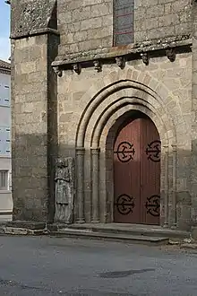 Le portail roman est classique avec ses deux arcs en plein cintre (en demi-cercle) supportés par deux colonnes.
