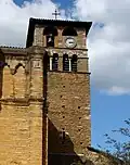 Le clocher, de forme carrée, est accolé au flanc est de l'église. C'est l'ancienne tour sud-est d'un château disparu datant du XIIIe siècle. Il a appartenu à une église antérieure à l'actuelle, et en a conservé une cloche du XVIe siècle, qui sonne encore les heures. En 1840, on lui adjoint cinq autres cloches réalisées par le fondeur Gédéon Morel[1].