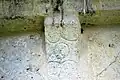 Les trois modillons sont érodés, mais on peut identifier un animal, peut-être un bouc et une tête humaine.