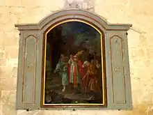 - Au-dessus du portail, est accroché un panneau en bois provenant apparemment d'un retable démantelé. Il comporte notamment un grand tableau dans un cadre cintré, qui mesure 1,85 m de hauteur et 1,22 m de largeur. Le sujet devrait être issu de la légende de saint Vaast d'Arras, mais n'a pas été identifié par l'abbé Beaudry. Il décrit la scène comme suit : « Un évêque en soutane violette et rochet avec l'étole rouge et la chape de même couleur à orfroi de tapisserie. Il est précédé de deux clercs en surplis et tient sa crosse. À sa gauche, un vieillard s'appuie sur un bâton ; à droite, un personnage en bleu invite par son geste l'évêque à pénétrer dans un édifice. Fond d'architecture. Sous l'enlevure d'une partie du tableau, peut-être des flammes. Au bas de ce tableau embu, les armes d'Étienne-René Potier de Gesvres, évêque de Beauvais en 1728 »[22].