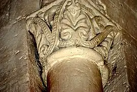 Sur le chapiteau oriental, deux créatures fantastiques se sont affrontées sur l'angle de la corbeille et sur le chapiteau occidental la décoration est un entrelacs simple.
