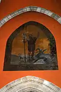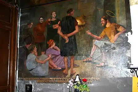 La scène évoquant sainte Catherine est à gauche de la porte d'entrée et celle de saint Sébastien à droite. Chaque tableau est divisé en deux panneaux : en haut, les scènes principales des mises à mort de Catherine et de Sébastien. Sous les scènes principales : à gauche, la controverse de sainte Catherine avec les docteurs d'Alexandrie ; à droite, saint Sébastien exhorte ses amis chrétiens. Les peintures sont inscrites[15] à l'Inventaire général du patrimoine culturel.