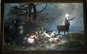 - En 1891 il exécute la toile La conversion de saint Hubert : La « Légende de saint Hubert » raconte que saint Hubert connaît une illumination mystique devant un cerf, qui lui révèle le sens du sacrifice rituel. Le cerf est symbole du Christ, et ses bois symbolisent l’arbre de la vie. Le saint renonce ensuite définitivement à la chasse pour se consacrer au Christ. La peinture est classée[6] à l'Inventaire général du patrimoine culturel depuis le .