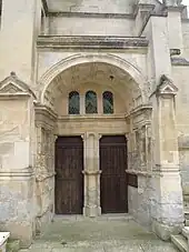 À droite du clocher, le demi-pignon de la nef est garni de crochets, comme le pignon flamboyant du croisillon sud. Il est percé d'une petite ouverture rectangulaire pour l'aération des combles. En dessous, l'on trouve un plastron avec deux écussons en bas-relief, ainsi qu'un cartouche. Les emblèmes héraldiques ont été bûchés à la Révolution française. La partie basse du mur occidental de la nef est en grande partie occupée par le portail, qui est profondément enfoncé dans le mur et abrité par une arcade en plein cintre, évoquant un porche. À droite, le porche est délimité par un contrefort assez mince, qui s'amortit par un glacis, et qui est en outre couronné d'une sorte de fleuron sur un socle cubique. Ce n'est pas l'un des deux contreforts d'angle de la nef, qui suivent à peu de distance. Le contrefort à droite du portail, ainsi que le contrefort à gauche du portail qui appartient au clocher, sont agrémentés d'un fronton triangulaire au niveau du portail. En dessous, des arrachements témoignent de plaques commémoratives ou inscriptions de l'Ancien Régime. Le porche s'ouvre par une arcade décorée d'un rang d'oves et d'un rang de feuilles lancéolées. L'intrados de l'arcade, ou le plafond du porche, est traité à la façon d'un plafond à caissons. Les caissons ne sont pas sculptés, ou ont perdu leur décor sculpté. Ils sont délimités par des guirlandes. Le tympan nu est ajouré de trois baies en plein cintre. Tout comme l'arcade, il repose sur la corniche d'un entablement aniconique. Cette austérité ne reflète pas la disposition d'origine, et les consoles sur lesquels reposent les linteaux et la forme donnée au trumeau ont suscité le jugement critique de Louis Régnier (mutilation ridicule)[8]. L'entablement y est décoré de palmettes de feuilles d'acanthe, et des formes géométriques occupent l'échine sous la corniche. On reconnaît également un rang de denticules. Aucun témoin des autres motifs n'est conservé de façon plus ou moins intacte, ce qui explique qu'on a renoncé à la restitution du décor sculpté lors de la restauration. L'on accède à l'église par deux portes rectangulaires, qui sont séparées d'un trumeau, et semblent également avoir été refaites de façon simplifiée. Les deux vantaux en bois pourraient dater d'origine. Sur les piédroits du porche, l'on remarque des niches à statues en plein cintre, qui sont flanquées de deux pilastres corinthiens cannelés. Alors qu'il y aurait eu de la place pour deux niches de chaque côté, le maître d'œuvre s'est contenté d'une seule, ce qui rompt avec l'ordonnancement du plafond. Du fait des nombreux manques, et la perte du tympan et du trumeau d'origine, il n'est plus possible d'apprécier la qualité de l'œuvre d'origine, et l'attribution à un architecte relève du domaine de la spéculation.