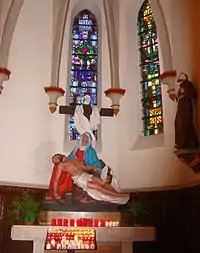 Vitraux des frères Ott de Strasbourg datant de 1949 et représentant: Jésus Christ entouré d’enfants ainsi qu’une nativité (transept Nord) ; l'Assomption de la Bienheureuse Vierge Marie (transept Sud).