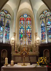 Le chœur est occupé par un important maître-autel néogothique de marbre blanc avec statues d’anges portant chandeliers. Le tabernacle en bois de l’ancien maître-autel du XVIIIe a été transféré dans la sacristie Nord. De part et d’autre du chœur, s’ouvrent deux sacristies. Au-dessus des portes des sacristies se trouvent deux cloches de chœur. L’ancien banc de communion composé de colonnettes de marbre blanc a été démonté et remplacé par un autel du même style pour se mettre en conformité avec les recommandations du deuxième concile œcuménique du Vatican relatives au déroulement de la célébration eucharistique et de la nouvelle liturgie. Le chœur est entouré de stalles en chêne. Elles intègrent deux niches en pierre de taille servant de lavabo et situées de part et d’autre du maître-autel. Le chœur est décoré de quatre grandes fresques tirées de scènes de l'Ancien Testament et réalisées en 1951 par Robert Maillard. Elles représentent : le sacrifice de Caïn et d’Abel ; le sacrifice d’Abraham ; la récolte de la manne dans le désert ; le sacrifice de l'agneau pascal.