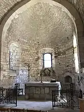 La travée droite du chœur est voûtée en pierre en berceau brisé. Au niveau de l'arcade la séparant de la chapelle occupant la base du clocher, une cavité ménagée dans l'épaisseur du mur est décorée de fleurs pentalobées identiques à celles du tympan de la porte latérale sud de la nef.