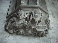Salle des Marmousets : culot sculpté représentant un homme et un ange avec un phylactère : « Ave Maria puer natus ».