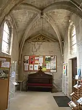 Les tailloirs sont suffisamment débordantes pour accueillir les bases des faisceaux de trois colonnettes, qui retombent depuis les chapiteaux du second ordre. Les socles sont polygonaux, et les bases aplaties. Les trois fûts sont de diamètre identique. Ils sont en délit, assemblés chacun d'une demi-douzaine de tronçons, et appliqués contre les murs hauts de la nef. C'est encore la marque d'une construction soignée, car les colonnettes pourraient être engagées dans le mur, et appareillées avec ceux-ci, à raison d'un bloc taillé par assise. Les chapiteaux du second ordre présentent des feuillages plus raffinés et sont l'œuvre d'un tailleur de pierre différent. Il a peut-être participé au chantier de l'abbaye de Maubuisson, qui se situe entre 1236 et 1244. S'il serait exagéré de parler de différence de style à propos des chapiteaux, c'est justifié pour les tailloirs, qui ne peuvent guère être antérieurs aux années 1230. Ce sont des tailloirs dits à bec, avec une pointe orientée vers la nef, et un seul tailloir recouvre le groupe de trois chapiteaux. On entre ici dans le registre du style gothique rayonnant, et la Sainte-Chapelle possède aussi des tailloirs à bec. La question des formerets est éludée par Louis Régnier. Les voûtes elles-mêmes datent en tout cas de la fin du XVe siècle ou de la première moitié du XVIe siècle, tout comme par ailleurs les culs-de-lampe dans les angles nord-ouest, sud-ouest et sud-est. ogives et formerets ont la même épaisseur, et adoptent le même profil prismatique et aigu. Les clés de voûte sont des médaillons, qui encadrent la figure en pied, sculpté en bas-relief, d'un personnage drapé. La polychromie éclatante pourrait suggérer une réfection moderne, mais elle est néanmoins d'origine. L'homme barbu et assis que l'on voit dans la première travée porte un objet, peut-être un parchemin, ce qui ne suffit pas pour l'identifier. Dans les autres travées, on voit saint Pierre, accompagné d'un P, et saint Ouen. En ce qui concerne les fenêtres, ce sont des lancettes simples en tiers-point, sans décoration. Elles ont probablement été refaites au XIXe siècle, mais devraient refléter l'état du milieu du XIIIe siècle[11].
