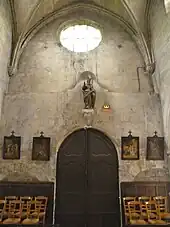 - Le tableau peint à l'huile sur toile représentant la scène du « Noli me tangere » est classée avec son cadre en bois sculpté et doré. Les deux sont datables du XVIIe siècle, et proviennent sans doute de l'abbaye de Maubuisson. La largeur est de 110 cm et la hauteur de 70 cm. Une restauration est intervenue au moment du classement en 1991[21]. La fixation du tableau sous verre est sans doute utile pour la conservation, mais les reflets que le verre renvoie réduisent l'effet de l'œuvre.
