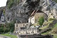 L'église a été construite devant un abri sous roche. Deux chapiteaux à entrelacs datés de la seconde moitié du XIe siècle pourraient être les vestiges d'une église antérieure.