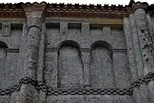 Dans chaque pan, la corniche est supportée par trois modillons. Au total, 23 modillons sont sculptés avec des figures géométriques, entrelacs, damier, etc. quatre étant abimés ou lisses. Il n'y a aucun modillon figuré. Cette série de modillons est plus tardive que la série qui orne la façade occidentale.