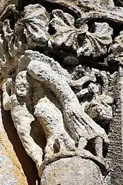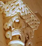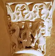Les deux chapiteaux qui encadrent la fenêtre axiale de l'abside sont également des exemples d'animaux superposés.