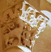 Sur la corbeille du chapiteau sud, un mammifère (un lion ou un loup) est montré de profil, sa longue queue dessinant une boucle. Il est opposé à deux serpents. Le premier serpent commence par enlacer la queue du lion, puis descend sur son flanc et se tourne pour happer sa cuisse gauche. Le second serpent, quant à lui, mord la patte avant droite de l'animal, alors que ce dernier vient de lui saisir le cou entre ses canines.