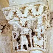 C'est le personnage central qui donne le sens à cette composition, sans doute une scène euphorique, car on discerne la jubilation sur les visages des deux hommes. Il existe un chapiteau complet, très semblable à celui-ci, dans le sanctuaire de l'église de Saint-Macaire. La troisième personne est une femme lascive, qui laisse supposer que le personnage central ici est un épigone de la luxure, soit une sirène-oiseau, soit une fille de joie.