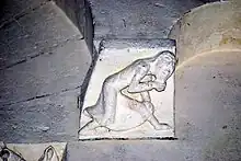 Entre le onzième chapiteau et la fenêtre nord se trouve une console qui soutient l'arc de la fenêtre nord. Sur la console, figure un homme barbu, à longs cheveux. Il est en génuflexion, le dos courbé. Il tient sa barbe de sa main droite et sa main gauche est posée sur son genou gauche. Cette sculpture, invisible de la nef, dans un endroit réservé aux clergé, avait une signification très négative pour eux. On trouve une sculpture semblable sur le cordon du sanctuaire de l'église de Saint-Martin-de-Sescas.