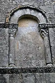 Les neuf arcatures aveugles doubles ont toutes un chapiteau central sculpté avec un décor végétal.