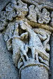Sur le chapiteau sud, sont affrontés deux quadrupèdes, à bec d'oiseau et à cou torsadé, sur les croupes desquels sont perchés deux oiseaux. Les queues des bêtes sont sexualisées et forment des panaches feuillus qui s'entrelacent sur l'angle de la corbeille. L'un des oiseaux est en train de béqueter une feuille qu'il a cueillie et l'autre en train de picoter une feuille encore fixée à l'une des queues.