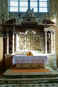 - Le retable et l'autel de sainte Geneviève se trouvaient au chevet du bas-côté nord, et étaient richement décorés dans le style baroque tardif. L'ensemble est susceptible de dater de la première moitié du XVIIIe siècle. Bien que s'agissant d'une œuvre de qualité, elle a été démontée à un moment indéterminé, et les côtés de l'autel s'étaient déjà perdus au moment de l'Inventaire[42].