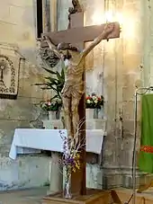 - Le Christ en croix en bois de chêne taillé, dans la nef, à gauche de l'arc triomphal, mesure 154 cm de hauteur, et date du XVIIIe siècle. La croix d'origine s'est perdue, et a été remplacée. Plusieurs réparations ont été effectuées avec des matériaux hétéroclites. La polychromie actuelle est moderne. L'œuvre est classée depuis 1966[25].