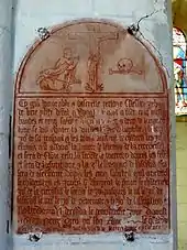 - La plaque de fondation du curé Jean de Brie, mort le , mesure 80 cm de hauteur et 57 cm de largeur. Le registre supérieur prend la forme d'un fronton cintré. On y voit, gravés, un Christ en croix au centre ; le défunt agenouillé, en prière, à sa gauche, et un crâne avec un tibia dans ses mâchoires à droite. Le reste de la plaque est entièrement couverte d'une longue inscription en écriture gothique. Les lettres, tout comme les motifs du fronton, sont rehaussés par un mastic rouge. L'inscription est la suivante : « Cy gist honorable & discrette person[n]e Messire Jehan / de Brie pbre demt a Warty lequel a fo[n]de cinq messes / hautes et cinq salutz d[ans] l[es]quelles y en a deux de requiem / l'une se doit cha[n]ter la veille de Jeha[n] baptiste & l'autre le/ jor de so[n] trespas & les trois aultres se cha[n]tero[nt] les jor q[ui] / s[en]suive[n]t c'est assavar la p[r]emiere le le[n]demain de la circo[n]cisio[n] / et sera de No[st]re Jésu, la seco[n]de le mercredy d'apres les festes / et sera de resurectione & la 3e le le[n]demain de l'asce[n]sio[n] qui / sera de asce[n]sio[ne] [...] & les cinq salutzs quil a ordon[n]e / se cha[n]tero[n]tsz es jours q[ui] e[n]suivent le p[r]emier se cha[n]tera le / jor de la circo[n]cisio[n] le seco[n]d le jor de pasques le iiie le jor de lasce[n]sio[n] le iiiie le jor de pentecoute & le ve le jor de l'assu[m]ption / Nostre Dame é decedda le penultieme jour daoust / 1607 priez dieu po[u]r son âme [...] »[30],[31].