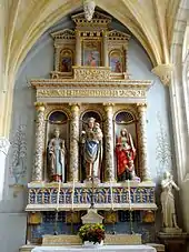 Le retable de la chapelle de la Vierge est en pierre taillée, peint et partiellement doré. Il mesure 500 cm de hauteur pour 210 cm de largeur, et date de 1559. Comme particularité, il ne descend pas jusqu'au sol grâce à un soubassement derrière l'autel, mais repose sur quatre consoles revêtus de feuilles d'acanthe, qui supportent une traverse sculpté de rinceaux. Cette dernière sert de soubassement au premier registre, le plus important, auquel s'ajoute un deuxième registre sous la forme d'une attique, nettement plus petit, et touchant au sommet de la voûte. Le premier registre est une sorte de péristyle destiné à mettre en valeur les statues abritées dans trois niches en plein cintre, dont le pourtour est orné d'un rang de petits godrons et d'un rang d'oves et de dards. Les quatre colonnes sont traités en faux-marbre, et munies de chapiteaux ioniques supportant un entablement. Son soffite est sculpté de rosettes, et sa frise de rinceaux intégrant des cornes d'abondance et des génies, ainsi que sept petits panneaux, qui inscrivent des roses, une tête de chérubin flanquée d'ailes déployées, la salamandre de François Ier (bien que déjà mort depuis douze ans), etc. L'architrave et la corniche sont également décorées, avec des rangs de perles et d'oves, et un rang de consoles soutenant la strate inférieure de la corniche. Pour venir à l'attique, elle se compose d'un corps central placé sur un soubassement, et de deux ailes latérales placées directement sur la corniche, surmontées chacune d'un entablement du même type que le précédent, et d'un fronton triangulaire décoré de même. Sur le corps central, l'entablement repose sur deux colonnes corinthiennes, tandis que les ailes latérales se contentent d'une seule colonne, et prennent appui contre le corps central de l'autre côté. Les trois segments ne contiennent pas de niches, mais affichent uniquement des tableaux entourés d'un cadre. Ils représentent des anges adorateurs et le Christ avec Dieu le Père, qui surgit d'une nuée et s'apprête à poser une couronne sur la tête de son Fils. Ce retable est classé depuis janvier 1913[7], et il a été restauré.