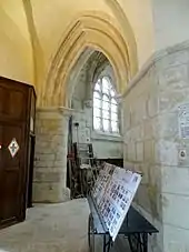 Au revers de la façade occidentale, au début des grandes arcades, les nervures sont reçues sur un cul-de-lampe flamboyant conventionnel, le seul dans l'église. Sa corbeille est sculptée de feuilles de vigne, symétriques de part et d'autre de l'axe, qui est celle des grandes arcades. Cette symétrie est rare à l'époque. Dans les angles nord-ouest et nord-est, les ogives retombent sur un fût unique, et les formerets se fondent dans les murs. Sinon, les supports sont analogues au vaisseau central, mais sans les frises et les tailloirs. Ce sont des faisceaux de trois fûts reliés les uns aux autres par deux gorges, et dont le fût médian est d'un diamètre légèrement supérieur aux autres. Les doubleaux se fondent dans le fût médian, et les formerets dans les deux autres fûts, tandis que les ogives se fondent dans les angles entre deux fûts. Pour une raison qui reste à identifier, les fûts engagés dans le mur gouttereau sont d'un quart plus élevé que les fûts des piliers des grandes arcades, et les doubleaux ainsi que les voûtes ne sont donc pas symétriques. Les clés de voûte sont garnis d'un écusson dans les deux premières travées ; d'une composition végétale découpée à jour dans la troisième travée ; d'un écusson entouré d'un ruban et d'une guirlande dans la quatrième travée ; d'une rosette Renaissance dans la cinquième travée ; et d'un pendentif entouré de quatre trilobes, flanqué de consoles et terminé inférieurement par un bourgeon. Des fenêtres existent à l'ouest et au nord : la baie du chevet est bouchée. Elles sont entourées d'une fine moulure concave et d'une gorge, et la modénature des meneaux est calquée sur celle des ogives. Les meneaux sont munies de bases. Les trois fenêtres des deux premières travées sont plus larges que les autres, et affichent un remplage Renaissance à trois formes en plein cintre. Les quatre baies suivantes sont à deux lancettes surmontées d'un losange entre deux étroites mouchettes (troisième et sixième travée), ou deux lancettes terminées en accolade, surmontées d'un soufflet simplifié entre deux étroites mouchettes (quatrième et cinquième travée). À l'instar des églises flamboyantes les plus abouties, telles que Louvres, Le Mesnil-Amelot et Versigny, la limite des allèges est soulignée par un larmier mouluré, qui est dissimulée par les boiseries à partir de la quatrième travée.