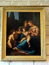 - Le tableau représentant l'Enfant Jésus jouant avec saint Jean-Baptiste sous la surveillance de la Vierge Marie et de sainte Élisabeth mesure 106 cm de hauteur pour 137 cm de largeur. C'est une copie du XIXe siècle de la Madone de l'amour divin de Raphaël, dont l'original est exposé au musée Capodimonte de Naples. Les deux jeunes enfants sont nus. Jésus est installé sur un genou de sa mère et nimbé ; d'un regard enjoué, il bénit Jean-Baptiste agenouillé devant lui, d'un air admiratif. Marie est également nimbée. Le regard attendri, elle joint les mains pour la prière en assistant à cette scène. Élisabeth, représentée comme une femme déjà âgée, baisse le regard, et sa main droite touche le bras bénissant de Jésus, sans tenir compte de son propre fils[18].