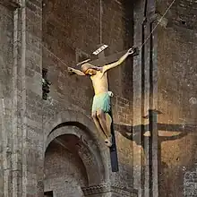 Au centre de l'abside, se dresse un grand crucifix en bois du XVe siècle réalisé par un artisan inconnu[2]. Sous le maître-autel, l'urne de San Vittorino (IIIe siècle), évêque d'Assise et patron du diocèse, a été réalisée en 1954 pour abriter ses reliques et celles d'autres martyrs[2]. Dans le presbytère, à gauche se trouve une statue de Notre-Dame en céramique, créée en 1981 par Francesco Vitali[2].