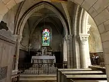 Chacune des deux travées de la chapelle est recouverte d'une voûte d'ogives, dont le profil est d'un tore aminci au profil d'amande, en somme encore proche de celui des bas-côtés romans, ce qui montre une fois de plus que la datation par les profils des ogives n'est possible que si l'on est en face des occurrences les plus précoces. Les ogives retombent les tailloirs des chapiteaux de crochets de la même facture que ceux de l'arcade entre la nef et l'ancienne croisée du transept. Ils sont portés par des colonnettes appareillées logées dans les angles. Les clés de voûte ne sont pas décorées, et les formerets sont absents. Un doubleau au profil de deux tores encadrant un filet sépare les deux travées. Ses chapiteaux sont analogues aux autres mais plus grands, et ses colonnettes sont engagées dans des dosserets. Les fenêtres en arc brisé, voire en plein cintre au-dessus de l'autel, sont fortement ébrasées et assez petites, ce qui s'explique par l'existence de la salle à l'étage, dont les murs doivent supporter le poids[6],[10],[15].