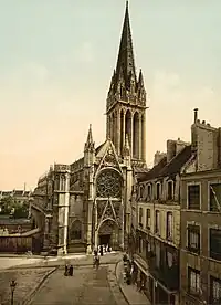 Les travaux s’échelonnent sur plusieurs siècles mais respectent l'unité d'ensemble qui offre encore aujourd’hui des parties remarquables. La tour est élevée en 1308, l'aile droite en 1410, l'aile gauche peu de temps après, le grand portail ou Portail Neuf en 1384. La façade nord est ornée au XIVe siècle d'une immense rosace d'une extrême légèreté. Au XIVe siècle, on construit également son célèbre clocher gothique, considéré comme « le roi des clochers de Normandie » et qui influencera de nombreux autres monuments. La flèche de la chapelle Notre-Dame du Kreisker à Saint-Pol-de-Léon par exemple s'en inspire fortement[4]. Les bas-côtés et les parties hautes de la nef sont construits au XVe siècle dans le style flamboyant. Menés par Hector Sohier, les travaux de l'abside, construite sur pilotis sur l’Odon, des voûtes du chœur et des ailes sont commencés en 1521 et terminés sans doute un demi-siècle plus tard. Contrastant harmonieusement avec le reste de l’édifice, c’est l'un des exemples les plus parfaits de la première Renaissance caennaise. Le porche sous la tour est restauré en 1608 avec des ornements en statues.