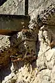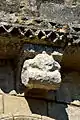- 10 Un couple nu enlacé : Ce modillon est partiellement érodé, mais il existe des dizaines, quasi identiques, dans des églises romanes de la Gironde, la Charente et la Charente-Maritme et en Espagne, voir par exemple Iconographie des modillons romans - les couples. Du fait que l'érosion est différent pour chaque modillon on peut établir la composition originelle. Il s'agit d'un homme et une femme nus en traîne de copuler.