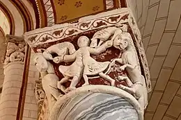 Ce chapiteau montre des lions à têtes d'hommes barbus avec des queues s'achevant en des mains humaines. La barbe est le symbole de l'homme dans le péché avec tous ses points faibles. La main est le symbole de l'action de l'homme. L'image représenterait donc un être en mutation. L'homme est sur le chemin de la lumière, d'où la présence des ailes, mais dans l'ensemble, c'est encore un pécheur, avec son corps animal et sa barbe. Par ses actions (la main), il est sur la voie qui le mènera vers Dieu. Cette iconographie est proche de celle que l'on peut voir sur un chapiteau de l'église de Colombiers (Vienne).